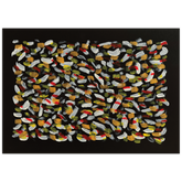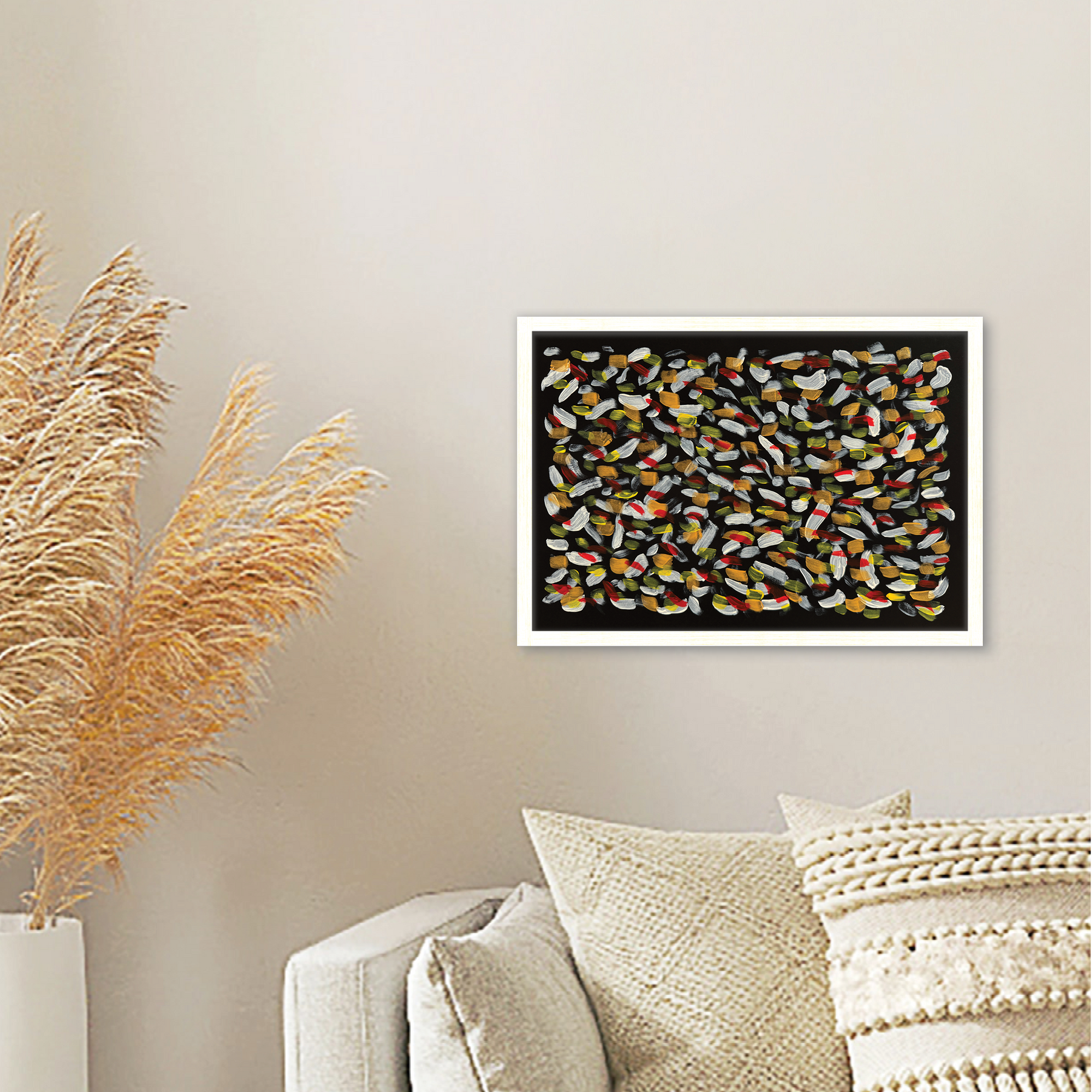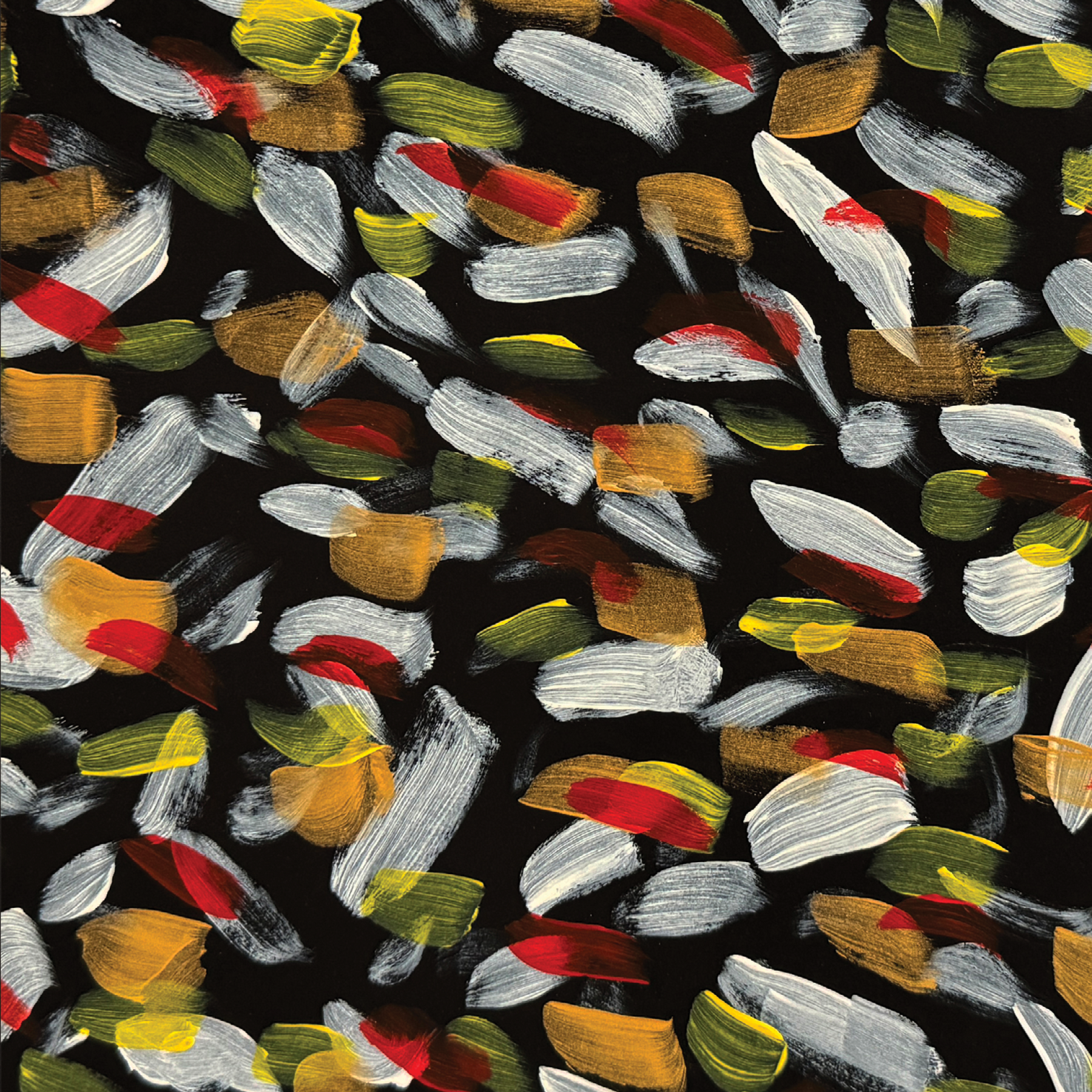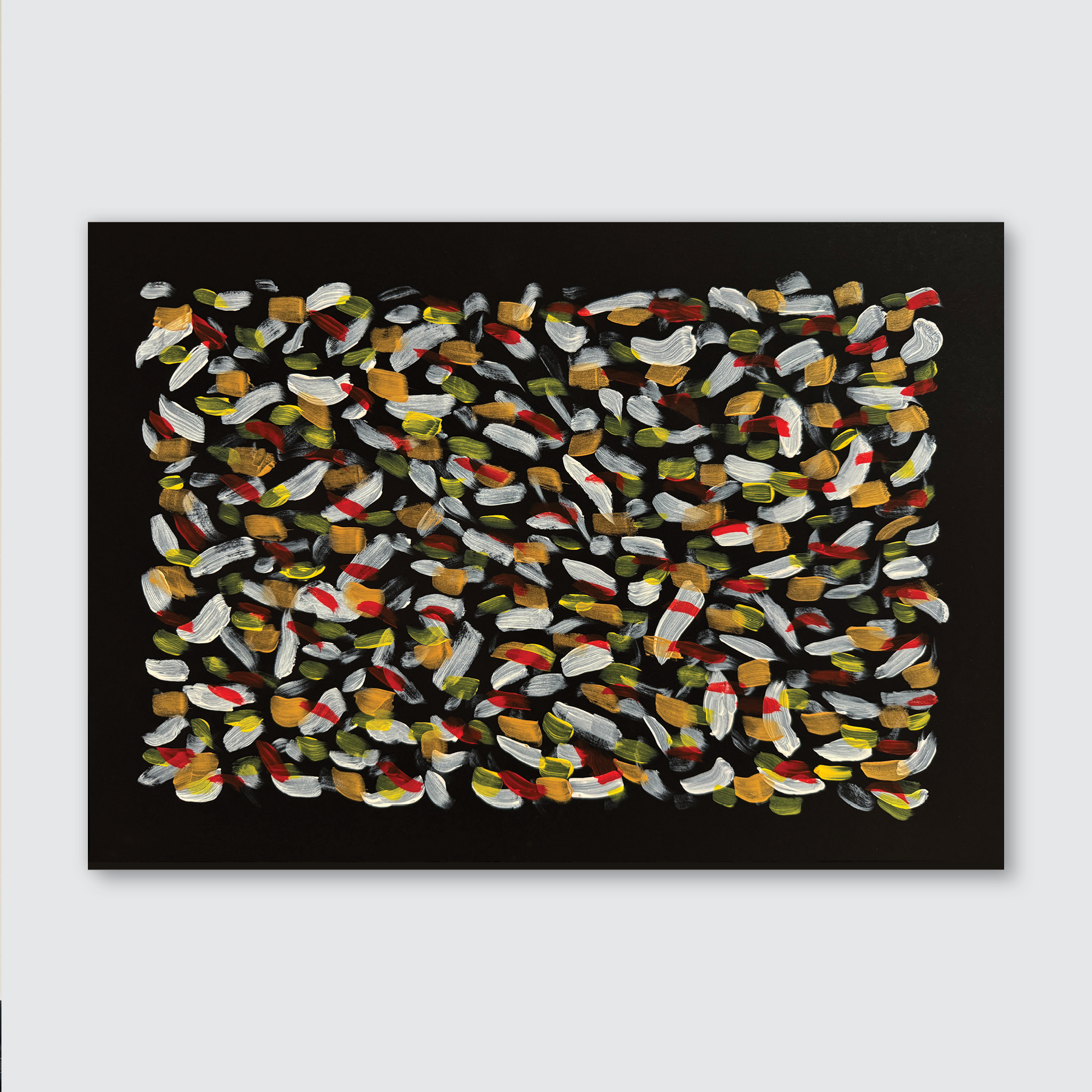 This painting creates a striking contrast between the dark background and the vibrant, expressive brushstrokes of white, gold, red, and green. The strokes appear to float on the canvas, like scattered autumn leaves or flickers of light in the night. The gold accents add a sense of richness and depth, while the bold whites and reds bring energy and movement to the piece. The overall composition feels dynamic and lively, with each brushstroke contributing to a sense of organized chaos as if capturing a fleeting moment of nature or light in motion. Made in NZ with love.