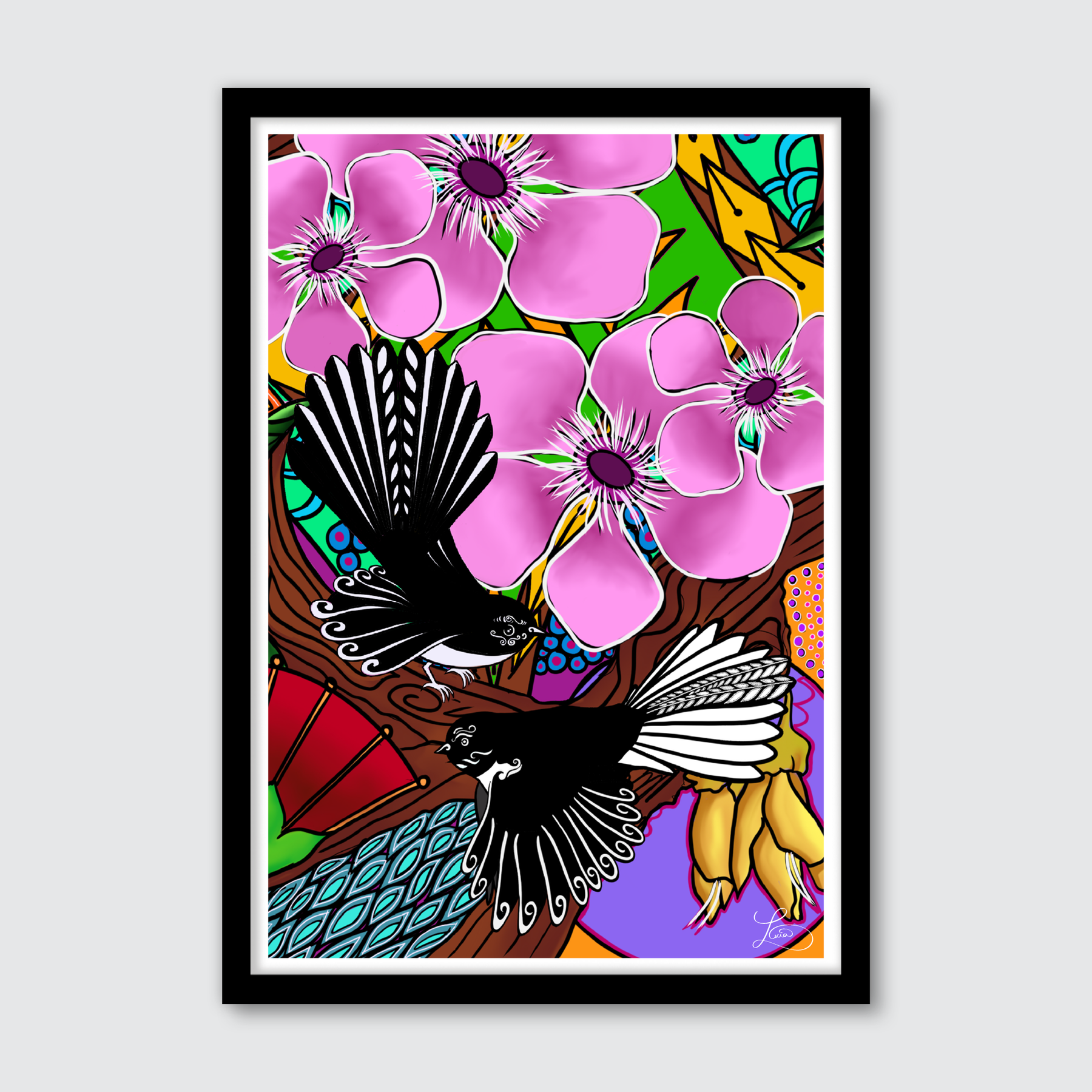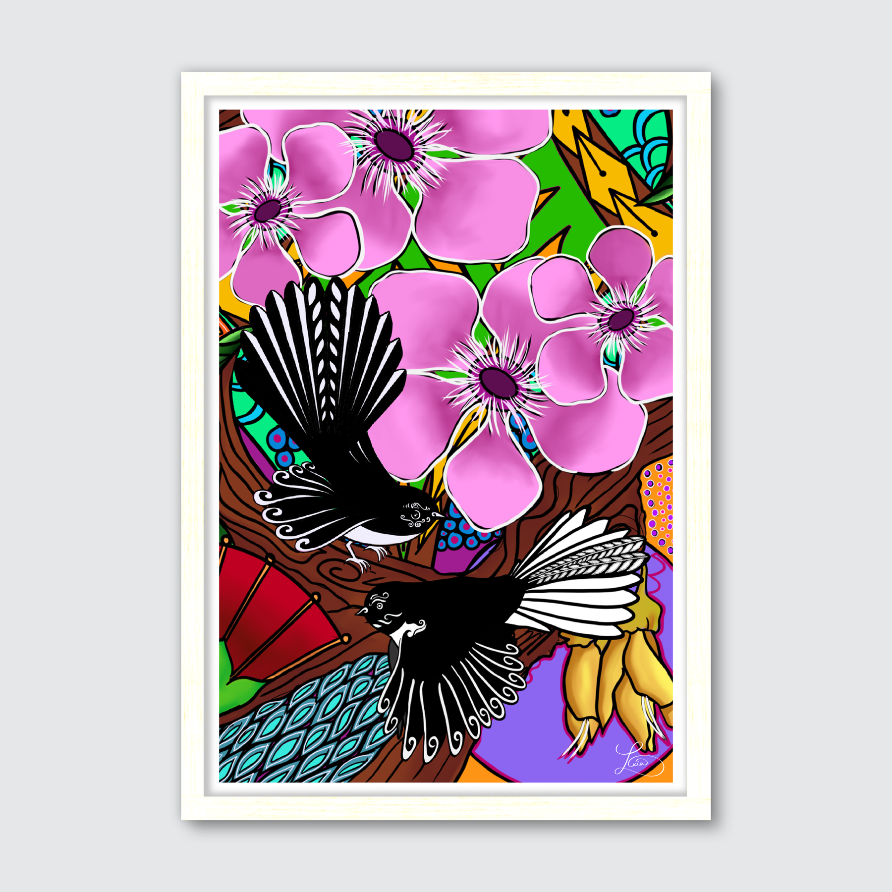 Digitally created, this bright and colourful design is part of a series of NZ birds. Arriving in NZ Lucia's first impression of birdlife here, was being followed by a Fantail during a native bush walk by a fantail (Pīwakawaka). Flitting from tree to tree, her walking would disturb the insects enough for the bird to find food and enjoy the path with her. Featuring two fantails exploring native flowers of NZ, flitting in and around colourful cultural patterns, this colourful execution of NZ birds and NZ flora and fauna will make a great addition to any space, home or office. Made in NZ with love.
