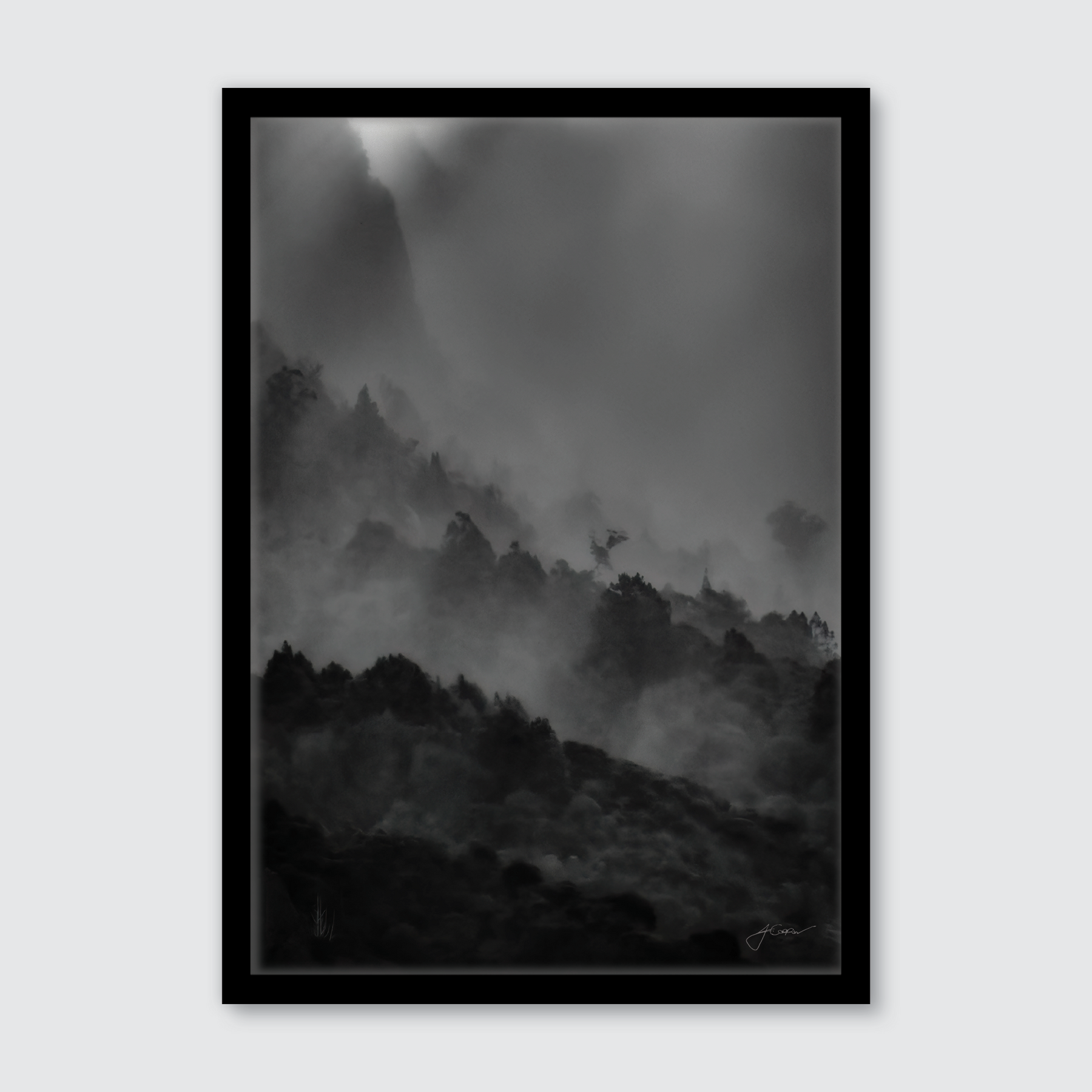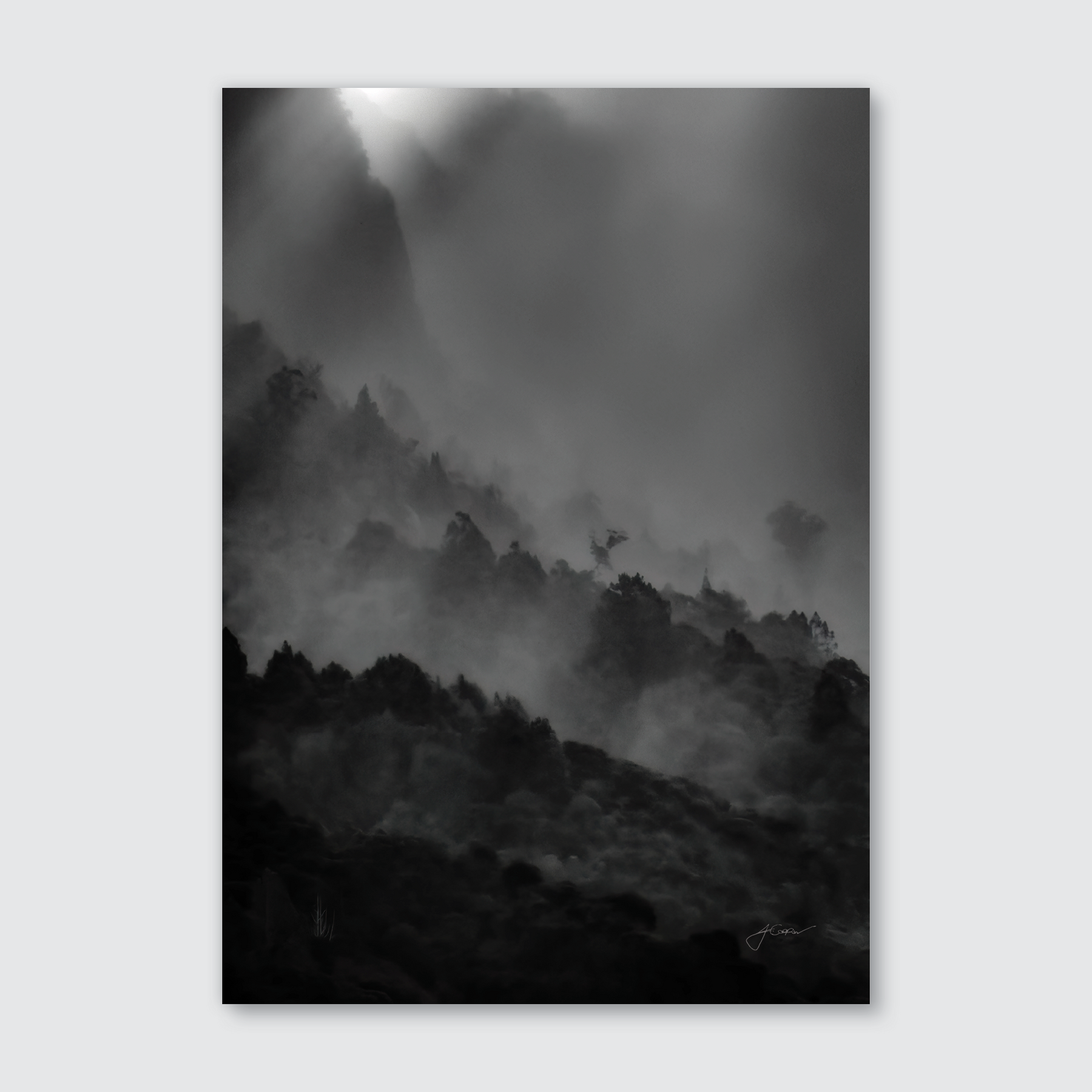 In this captivating photograph, find yourself standing amidst a serene and mystical landscape. The air is thick with a gentle mist that dances between the trees. It has a real mystical feel to it, like you’re peering into an enchanted forest blanketed in fog. The trees are just silhouettes, and there is a soft light filtering through the mist, the gentle glow of dusk. Made in NZ with love.
