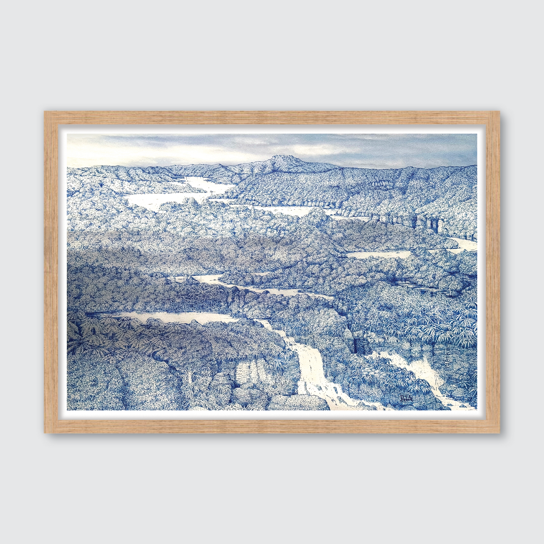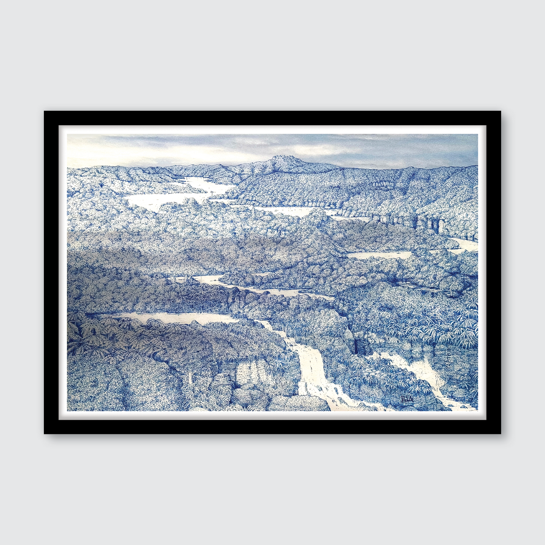 One of a series entitled, “ Land in the Clouds”, all based on photographs of cloud formations. The shadows of the clouds are still apparent top and centre. Created with ink markers over a photograph of a cloud formation, Peter invites the viewer to follow the river into the heart of the landscape giving a sense of an old NZ. Using a style of Pointillism, a technique of painting where small, distinct dots of colour are applied in patterns to form an image. This is sure to make a great addition to any home, space or office. Made in NZ with love.