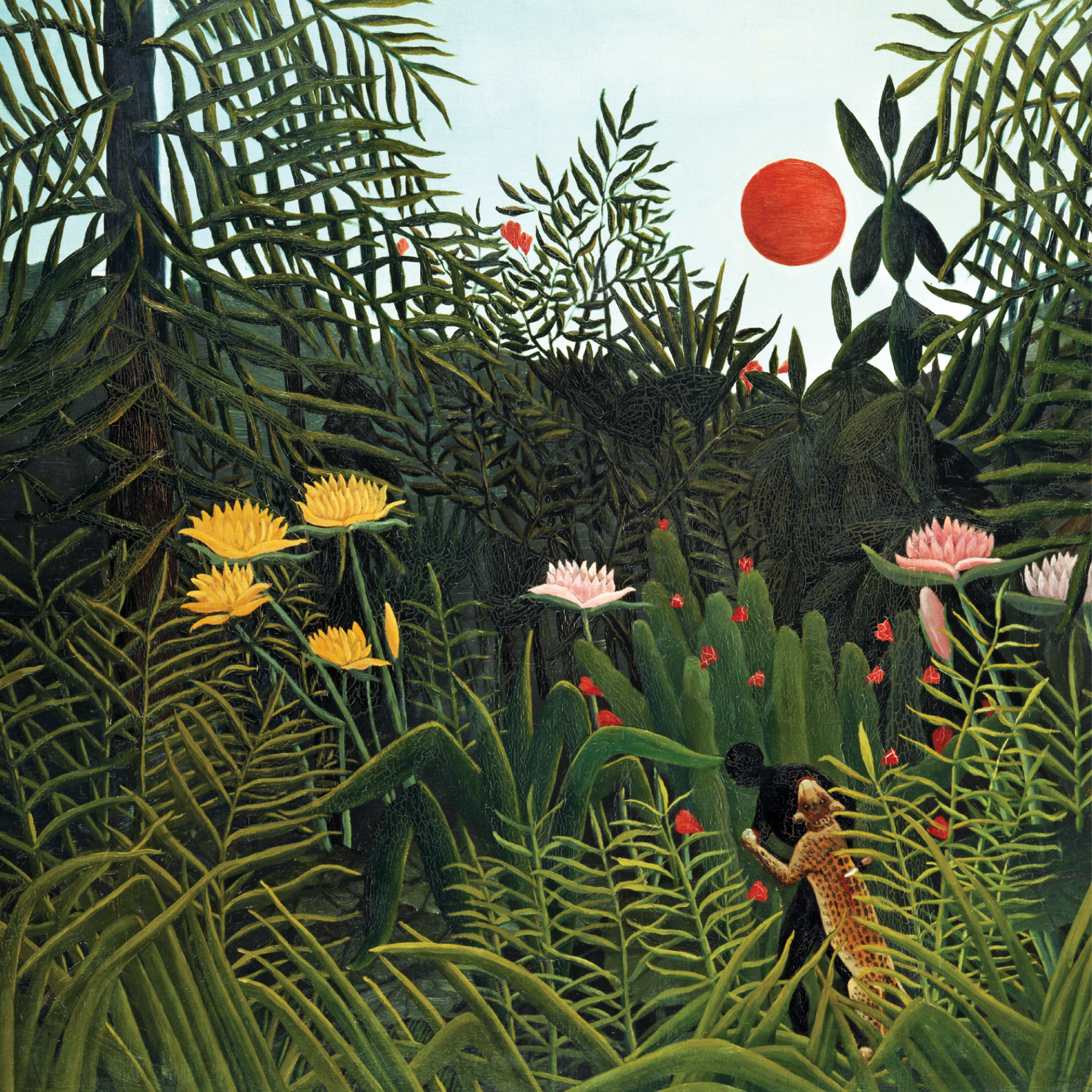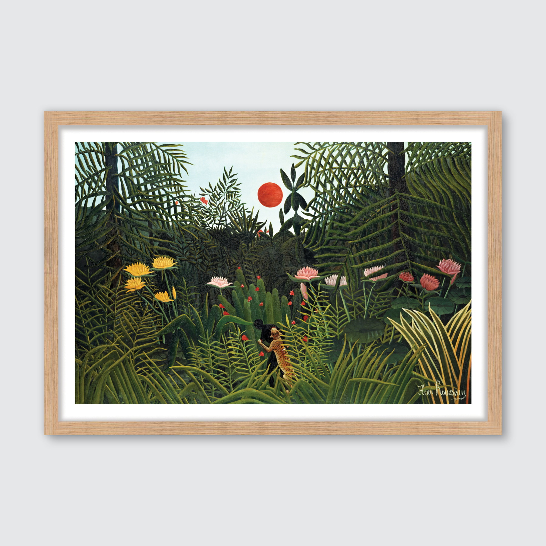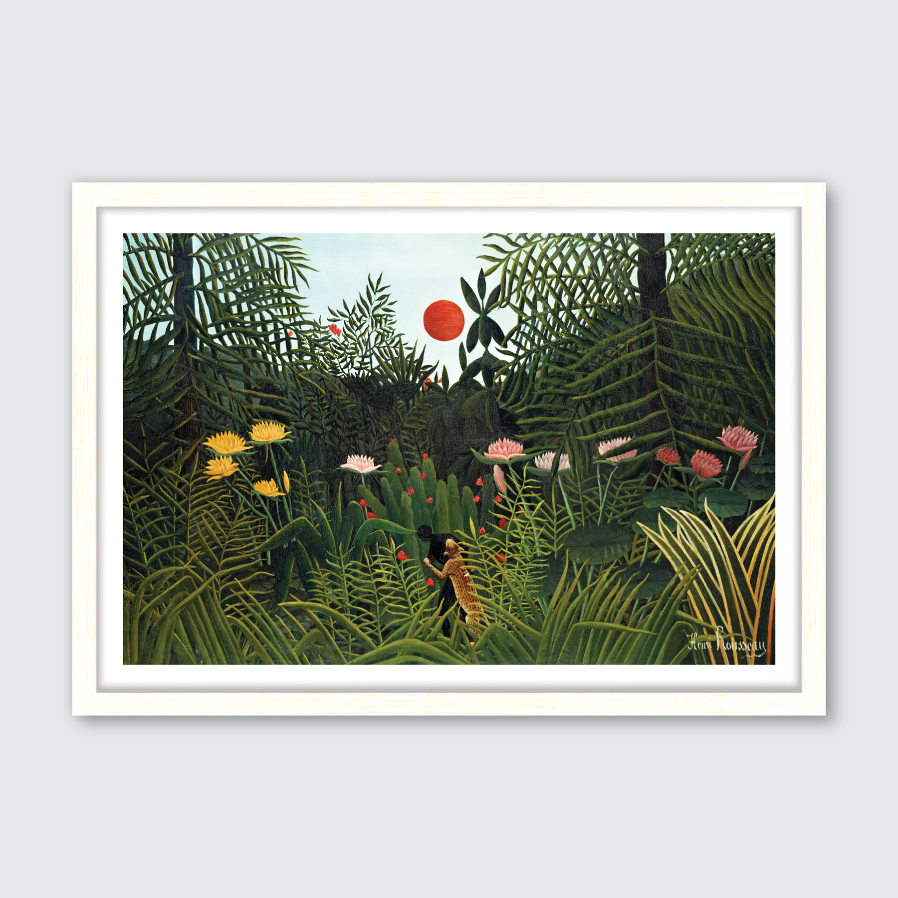 Surrender to the radiant majesty of Virgin Forest with Sunset, a captivating painting by Henri Rousseau (1844–1910). Unveiled in 1907, this evocative work bathes the viewer in the golden embers of dusk, illuminating a pristine wilderness with warm, fiery hues. Rousseau’s untutored brilliance thrives here, his bold strokes and vivid layers weaving a dense canopy of untamed foliage, pierced by the sun’s fading glow and shadowed by enigmatic silhouettes. Ideal for a rustic retreat or a sanctuary of natural awe, this piece threads the primal splendour of the untouched into any space, glowing with serene power and timeless reverence.