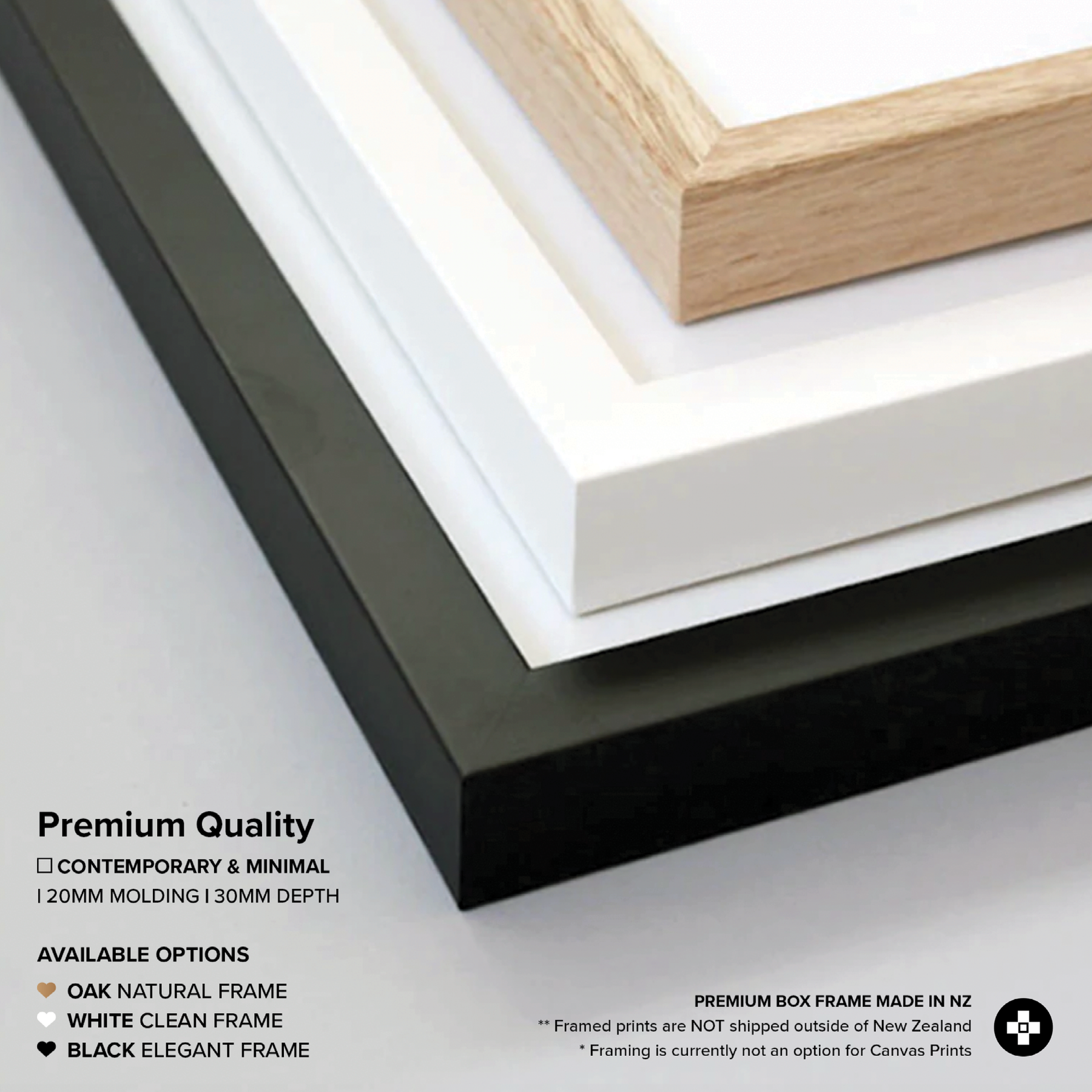 Our standard framing option is a premium moulded boxed frame, handcrafted locally in New Zealand. It features 20mm mouldings and a depth of 30mm, and is available in Natural Oak, Black, or White. Each framed print is backed with MDF and includes hanging fittings. We carefully wrap each framed print in bubble wrap and place it in a protective cardboard box for safe delivery.